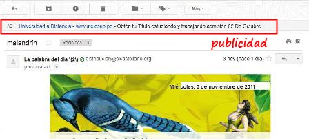 Google parece estar aprovechando al máximo los espacios en la bandeja para mostrar publicidad. Cada vez que leas tus mensajes, podrás notar un módulo horizontal con un anuncio publicitario entre los mensajes de correo y los botones en la barra superior.