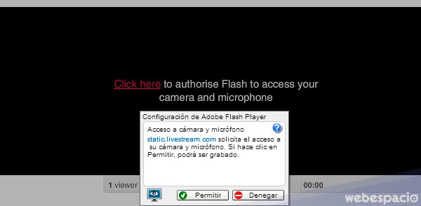 3. Luego de permitir la autorización de ingreso al twitcam, nos aparecerá un cuadro que nos pedirá autorización para acceder a nuestra cámara web y micrófono, ya sea de la laptop o de la computadora, ahí debemos darle clic a "permitir".