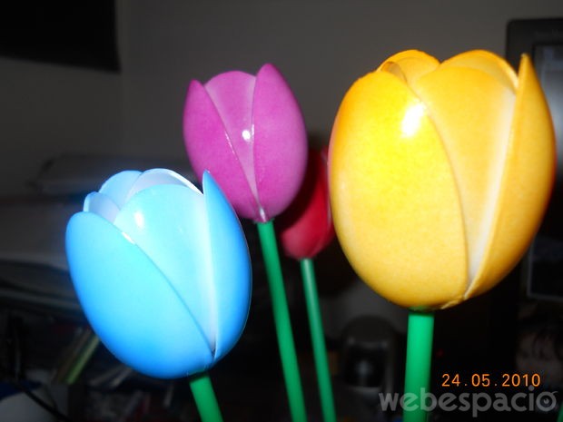 Pinta las cucharas y cortales sus palitos. Ahora pega las cucharas como si fueran un tulipán, tres cucharas adentro y tres cucharas afuera, tal como lo muestra la foto. Únelas en el centro con más pegamento. En la parte de la base únelas con un palito para globo, o con algún palillo de madera. Haz muchos tulipanes de diversos colores y adorna tu casa con ellos.