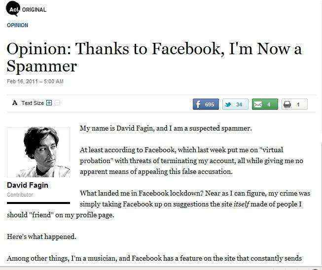 Esto llevó a David a escribir en una pequeña sección de las noticias de AOL, su opinión respecto a lo sucedido, en el cual el afirmaba que él no solamente se sentía insultado por el hecho de haber sido etiquetado como un spammer, sino también, por cómo una empresa de la talla de Facebook no cuente con un departamento de servicio.
